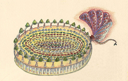 beschleunigt wird. Dieses ausgespannte Rad sieht gar wunderbar schön aus. Seine Farbe ist blauviolett. Seine Verbärmung ringsherum ist glänzendrot und selbstleuchtend, wie Wölkchen in der Abendröte. Das ganze Rad ist